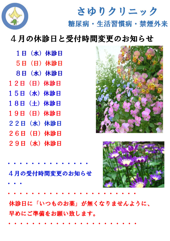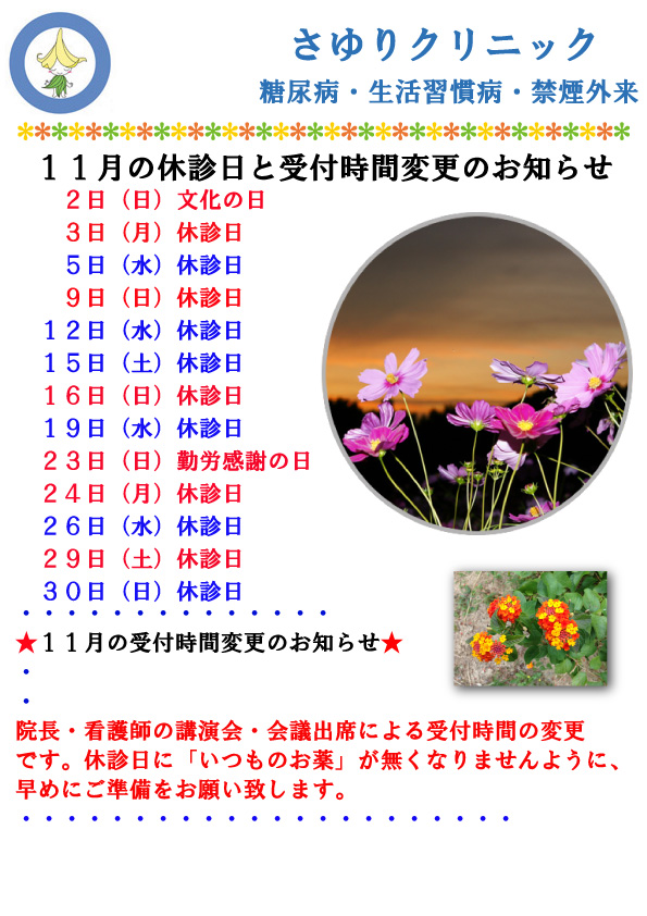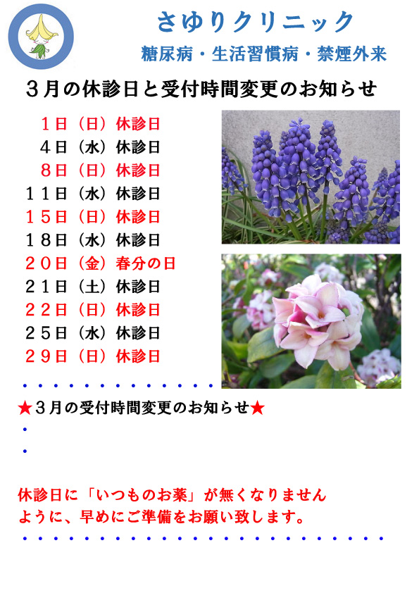 | ★休診日変更お知らせ★ 水曜日、日曜日、祝日、第3&第5土曜日は休診日です ・・・お間違えのないように・・・ |
